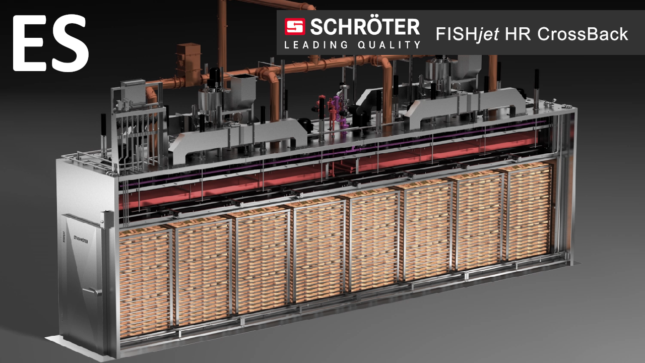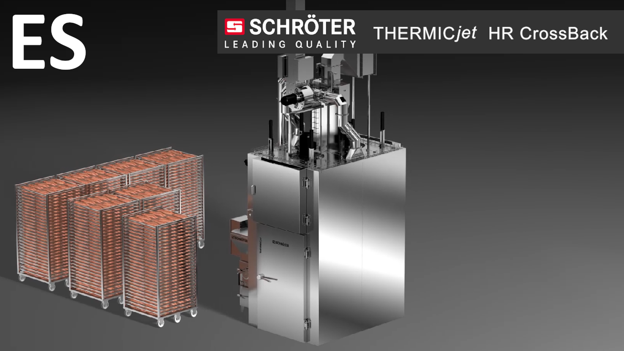 El principio CrossBack es sinónimo de una innovadora conducción de aire de flujo transversal que puede integrarse en diversas instalaciones Schröter, como THERMICjet®, FISHjet®, SEMIjet® y BAKEjet®. Este sistema se ha desarrollado especialmente para procesar productos planos de forma especialmente cuidadosa y uniforme con una alta ocupación del carro. Ya sean productos cárnicos, pescados, alternativas vegetales o snacks, CrossBack garantiza resultados perfectos para una amplia gama de aplicaciones gracias a su conducción de aire horizontal reversible.