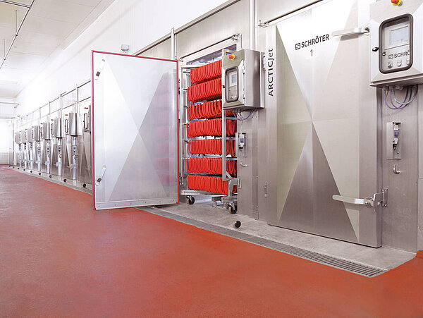 Eine weitere Option der ARCTICjet®-Systeme ist das Integrieren einer Dampf-Hygienisierungseinrichtung, die in Kombination mit einem effizienten Reinigungssystem eine zuverlässige Betriebs- und Produktsicherheit gewährleistet. So bietet Schröter nicht nur eine effektive Kühlung, sondern auch höchste Hygiene- und Prozesssicherheit.