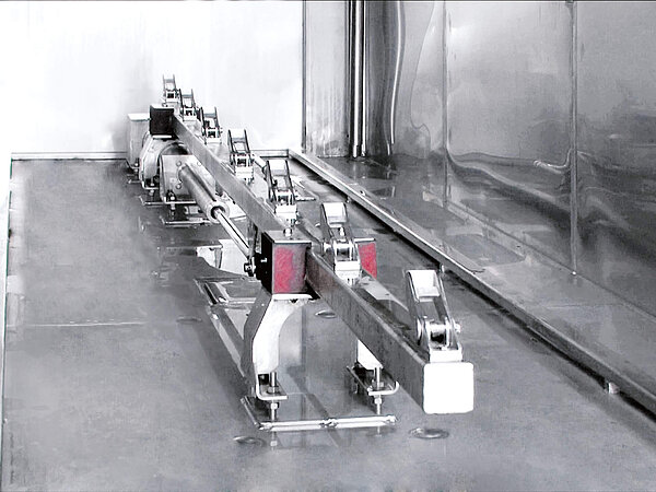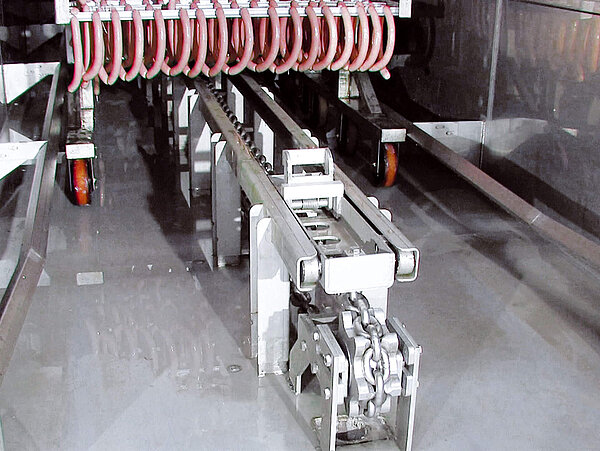 Für jeden Anwendungsfall stellt Schröter die passende Fördertechnik bereit. Von Ketten- und Schubstangenförderern mit Elektro- oder Pneumatikantrieb bis hin zu Systemen für Hängebahnen – die Vielfalt der Möglichkeiten garantiert eine optimale Prozessintegration. In Kombination mit manuellen oder automatischen Pufferlösungen auf der Einfahrt- oder Ausfahrtseite wird ein reibungsloser Ablauf zwischen den einzelnen Produktionsschritten sichergestellt. Das Fördersystem, ein wesentlicher Bestandteil des SEMIjets®, bewirkt den reibungslosen Materialfluss.