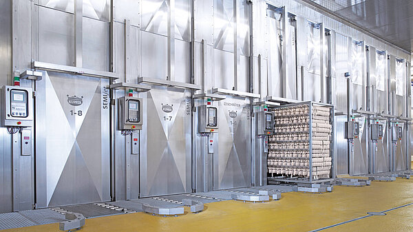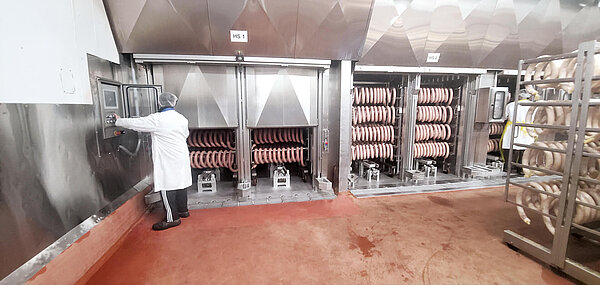 Die SEMIjet®-Anlage ist eine semikontinuierliche Durchlaufanlage und kombiniert einzelne Prozesszonen wie Heißräuchern, Kochen, Backen und Intensivkühlen in einem Anlagenkonzept. Sie arbeitet automatisiert, chargenweise und zeichnet sich durch ein automatisches Fördersystem sowie eine innovative Steuerung aus. So ermöglicht der SEMIjet® präzise wiederholbare Prozesse bei gleichbleibender Produktqualität.