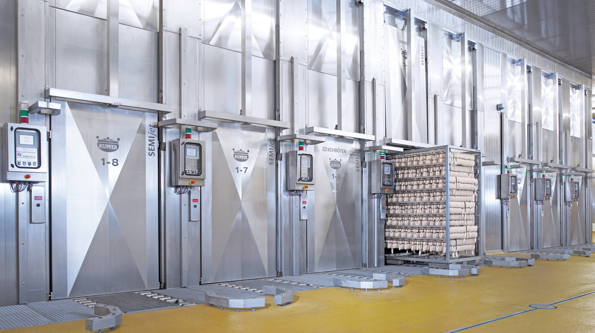 Die SEMIjet® ist modular aufgebaut und besteht aus separaten Prozesszonen wie beispielsweise einer Heißrauchzone und einer Intensivkühlzone, die kombiniert eine SEMIjet® HRIK bilden. Jede Zone bietet präzise und wiederholbare Prozesse wie Röten, Trocknen, Heißräuchern, Kochen sowie Duschen, Kaltluftkühlen und Kaltluftanfrieren.