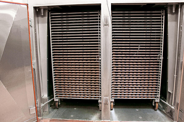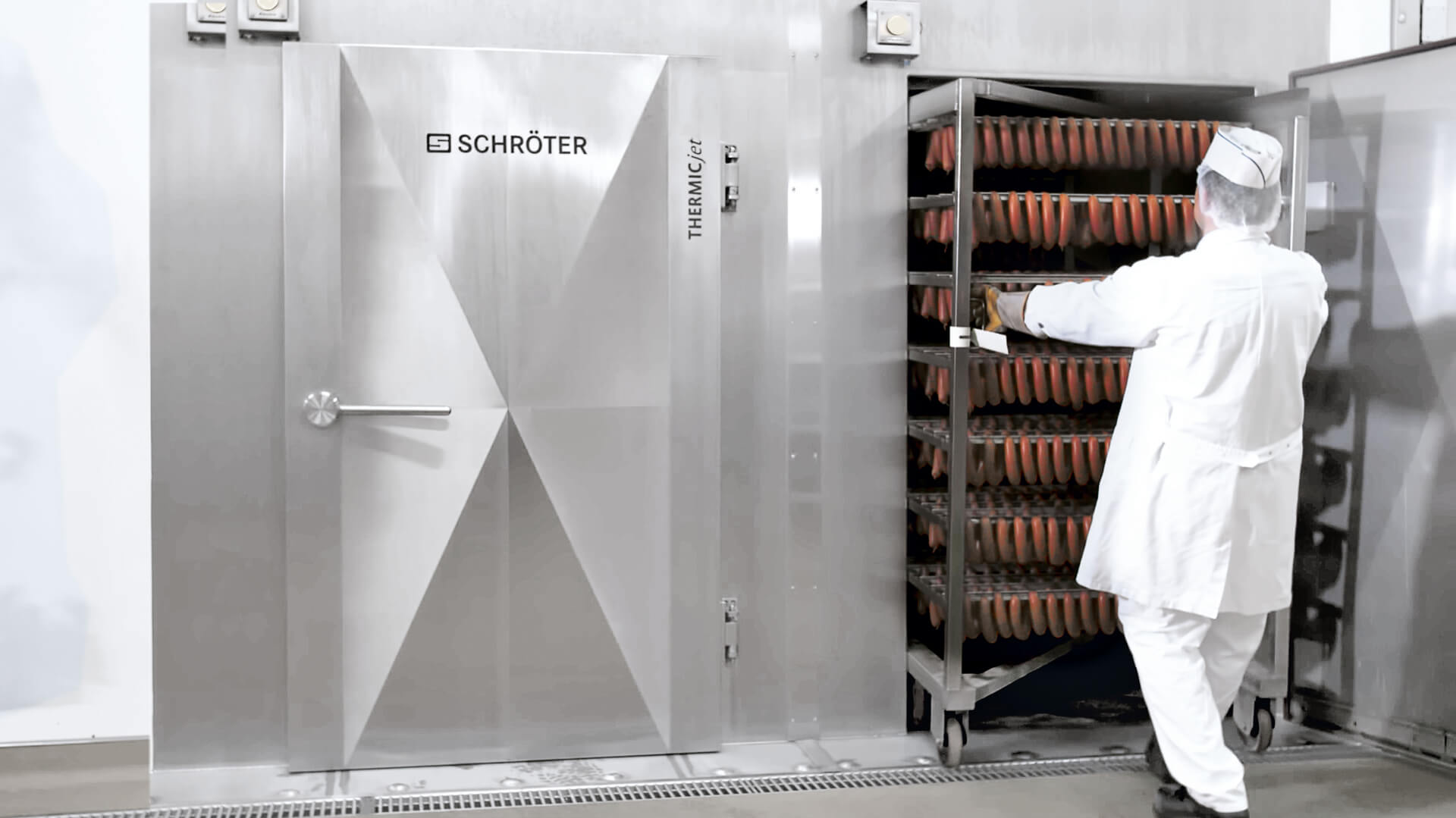 Dank der vertikalen Luftführung mit alternierendem Luftstrom und flexiblen Beladungssystemen verarbeitet der THERMICjet® sowohl große als auch kleine Chargen – je nach Anlagengröße – gleichmäßig und effizient. Intervallduschen sorgen für eine erste Kühlung der Produkte und integrierte Reinigungssysteme gewährleisten maximale Betriebssicherheit und Hygiene.
