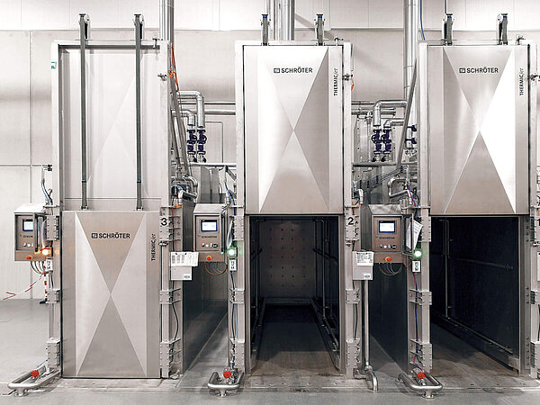 Für eine verlängerte Mindesthaltbarkeit bietet Schröter Pasteurisieranlagen an, die sich durch ein besonders produktschonendes Pasteurisierungsprinzip auszeichnen. Sie sind ideal für Spezialitäten wie Schwarzbrot, Lachsrogen oder Fleischwaren. Die Produkte werden vorzugsweise in hitzefesten Kisten, gestapelt auf Europaletten, thermisch behandelt. Der Pasteurisationsprozess arbeitet mit Niederdruckdampf, der den Innenraum der Anlage auf etwa 100 °C bei einem Druck von 140 bar erhitzt. Während dieser Phase wird der Druck gezielt reguliert, um Produktschäden zu vermeiden. Durch die Zufuhr von Druckluft oder zusätzlichem Niederdruckdampf bleibt die Integrität der Verpackung, wie Folienverpackungen, gewährleistet.